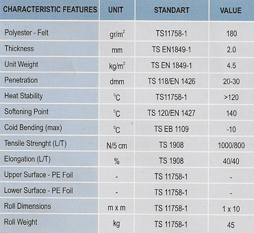 Polyester Keçe taşıyıcılı, APP (atactic polipropilen) katkılı bir yüzü polietilen film kaplı, diğer yüzü kırmızı mineral Taş Kaplı Plastomerik Su Yalıtım Membranı.