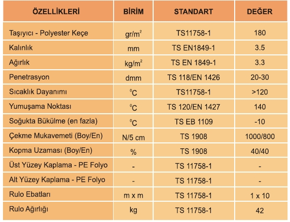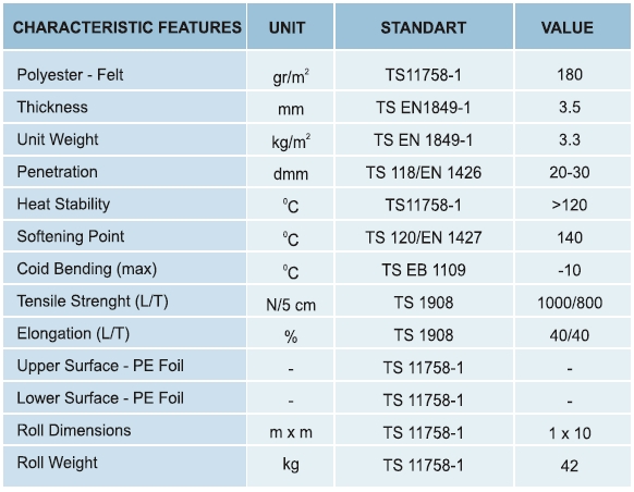 Polyester Keçe taşıyıcılı, APP (atactic polipropilen) katkılı bir yüzü polietilen film kaplı, diğer yüzü kırmızı mineral Taş Kaplı Plastomerik Su Yalıtım Membranı.